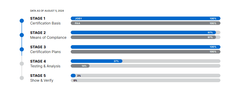 However, Joby was the first company to complete the first, second and third of five stages of the certification process needed for commercial service. As of 5 August, 37% of the fourth stage was completed on the Joby side.