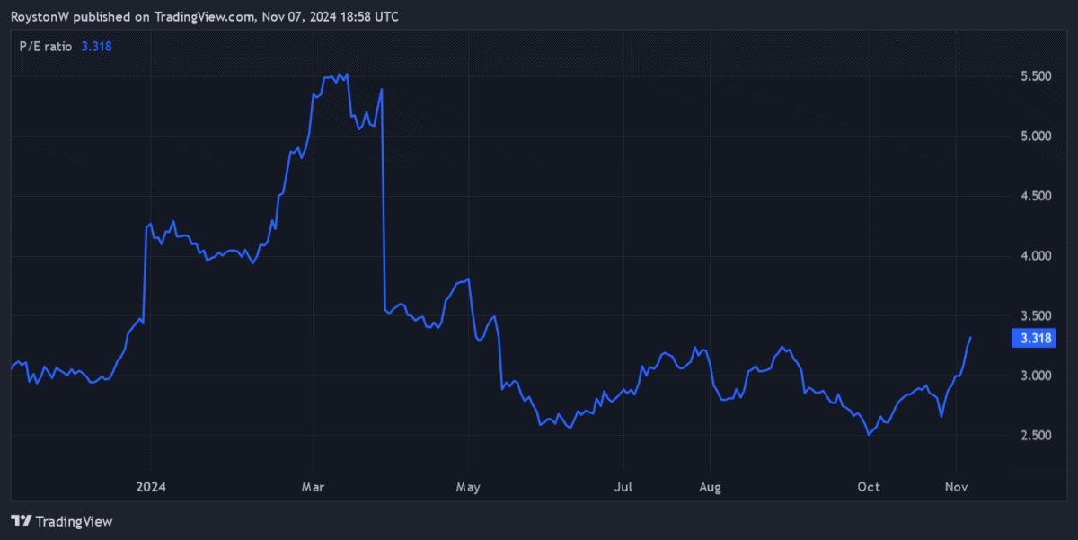 The emerging market bank trades on a forward price-to-earnings (P/E) ratio of 3.3 times