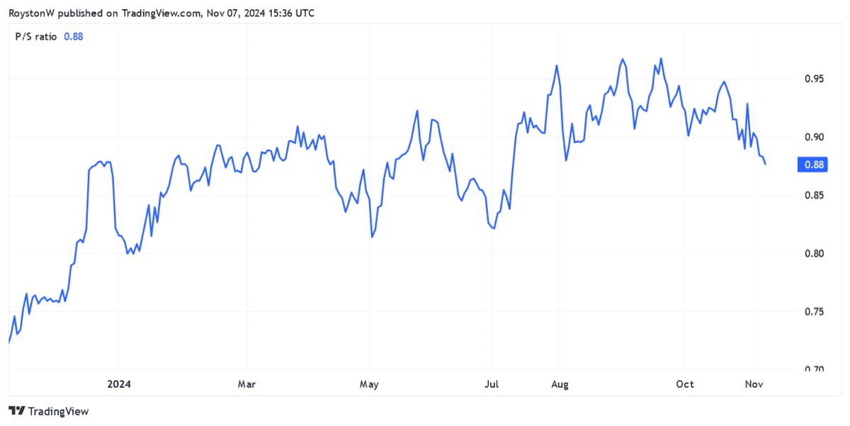 Finally, a price-to-book (P/B) ratio suggests the firm trades at a discount to the worth of its assets, as shown below. Like the P/S ratio, value territory sits below 1.