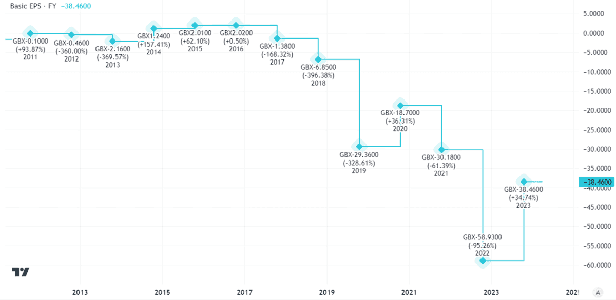 A look at its basic earnings per share shows not only that the company has been heavily loss-making, but that its performance in that regard has got much worse over the past five years or so.
