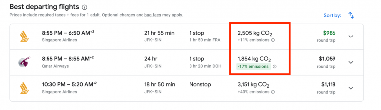 This acts as a behavioral nudge that lets you choose the most environmentally conscious option with all other variables being the same. In the example pictured, the Qatar Airways flight costs a bit more and has slightly lower emissions than the Singapore Airlines flight.