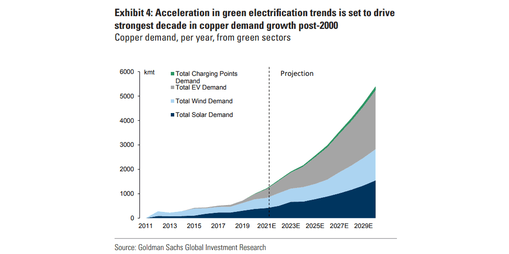 Commodities strategist Ewa Manthey of ING Bank notes that “while traditional demand drivers, such as property and construction, face headwinds, demand from the green energy sector continues to grow”. Copper consumption from the EV and clean energy sectors is tipped to keep expanding over the long term, too, as the chart below shows.