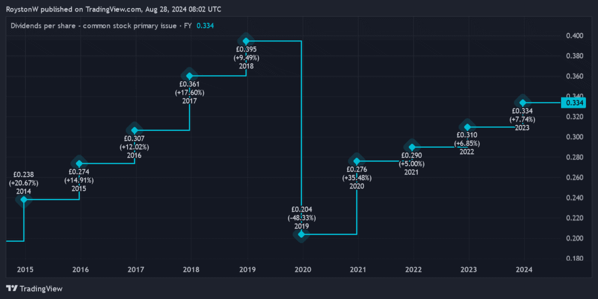 As we can see, the dividend on Aviva shares has risen regularly over the past decade. The only exception was in 2019. Back then, the business took the prudent decision to cut the full-year payout due to Covid-19-related uncertainty.