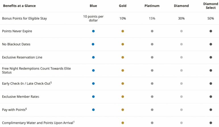 There are a total of five different tiers of Best Western elite status. The most basic, Blue, has no requirements; this is the level you’ll receive when you sign up for the program. The highest tier, Diamond Select, normally requires you to earn at least 50 nights, 40 stays or 50,000 bonus points.
