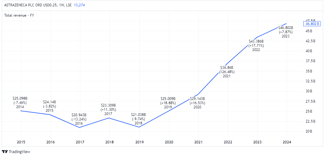AstraZeneca has grown its revenue rapidly in recent years, from $25bn in 2020 to $46bn in 2023.
