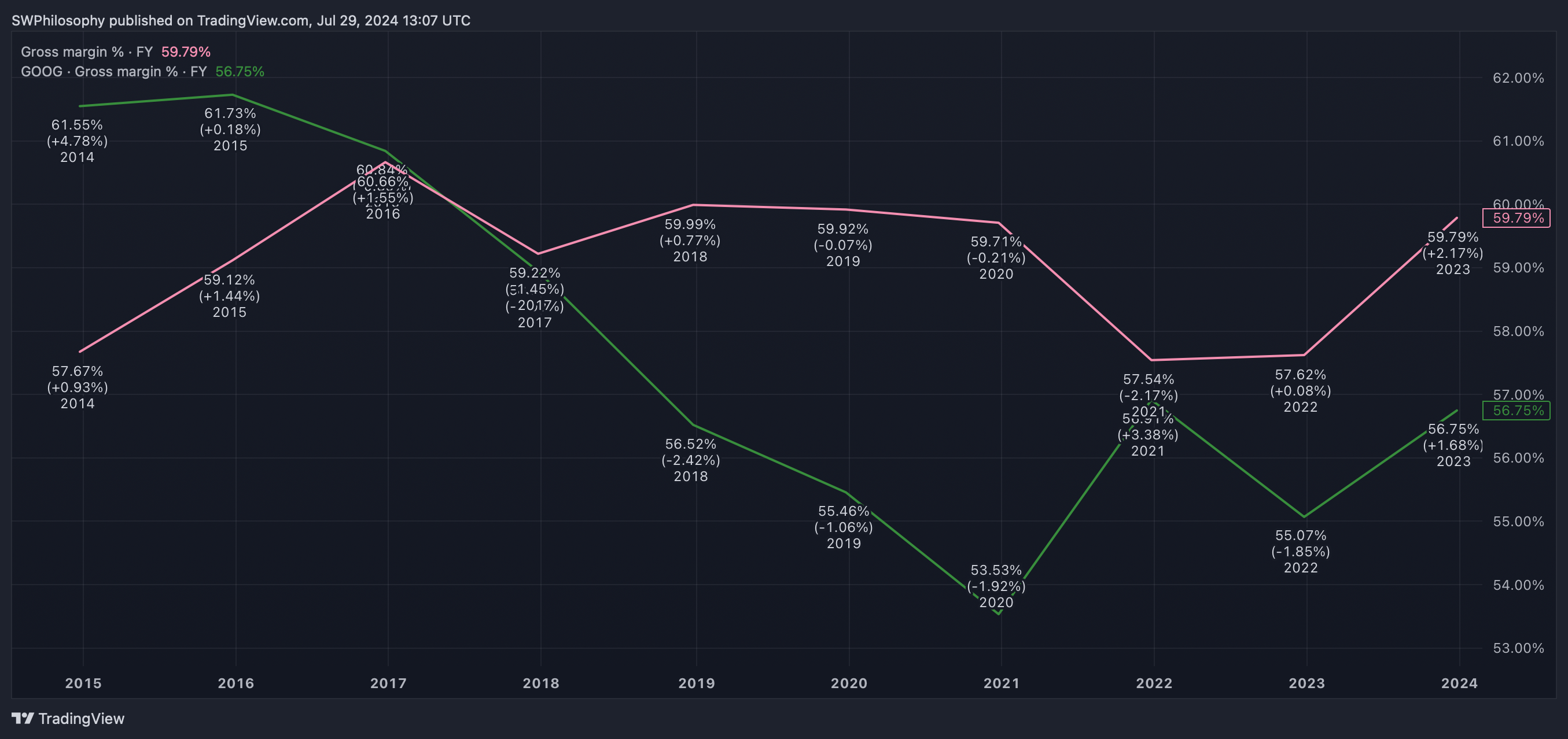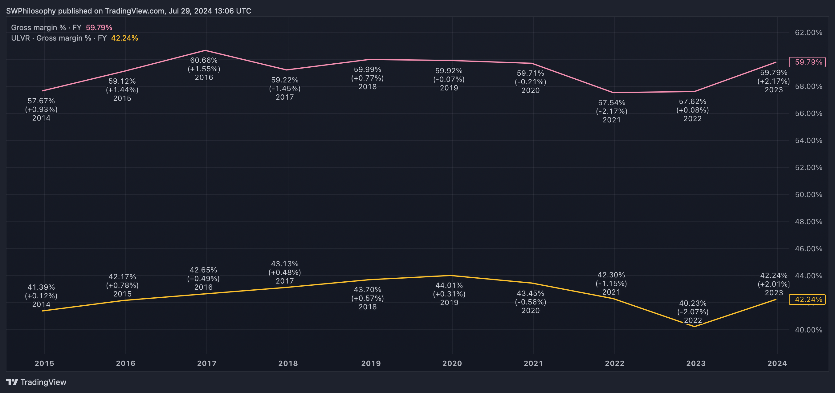 Over the last 10 years, the firm has consistently maintained gross margins in excess of 57%. That’s far higher than Unilever, whose best year resulted in just under 45% margins.