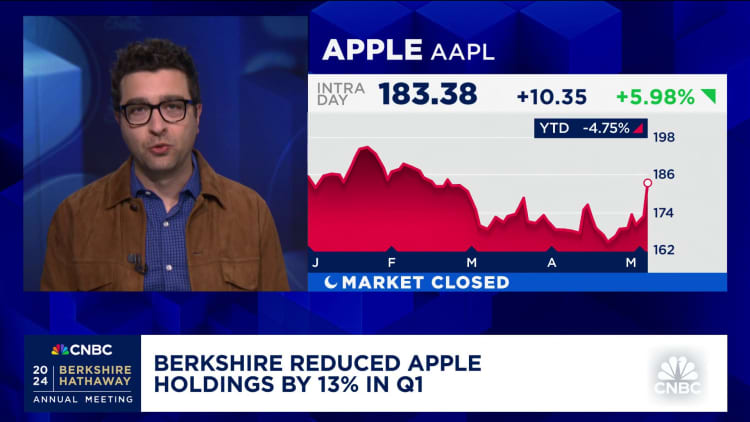 In its first-quarter earnings report released Saturday, Berkshire Hathaway reported that its Apple bet was worth $135.4 billion, implying around 790 million shares. That would mark a decline of around 13% in the stake. Apple was still Berkshire’s biggest holding by far at the end of the quarter.