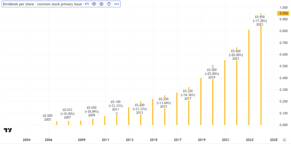 One UK share last year raised its dividend per share by 25%. That followed 23% growth the prior year – and 20% the year before that.