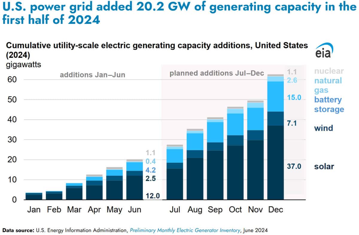 In the first half of 2024, solar accounted for 59% of newly operating generating capacity in the US. The following chart highlights just how important solar is becoming in the US energy mix.