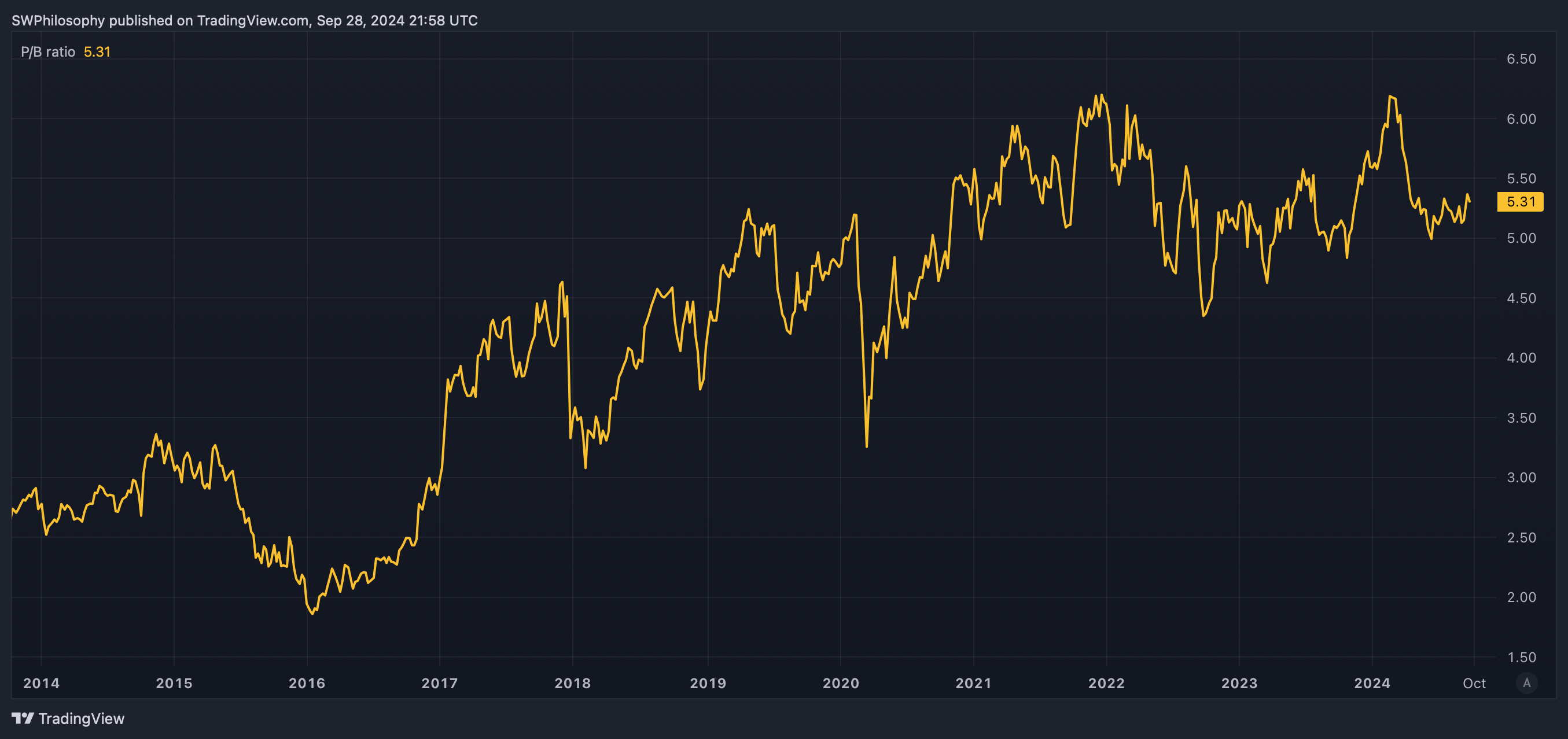 Right now, things are different. The stock trades at a P/B multiple of 2.6, which is as low as it has been at any time in the last 10 years – and is why I think it’s unusually cheap.