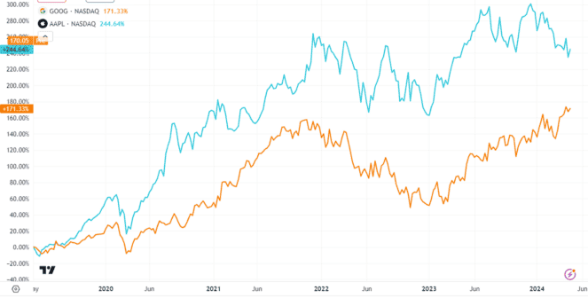 That is a markedly better performance than the (very impressive) 148% gain recorded by Alphabet stock over the past five years (this chart shows Apple in blue and Alphabet in orange).