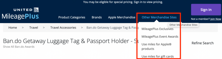 If you’re looking for other ways to spend your miles, you can navigate to the top of the page where you will find the “other merchandise sites” dropdown menu. This menu will give you spending options such as MileagePlus Exclusives, MileagePlus Event Awards, using miles on Apple products and using miles on gift cards.