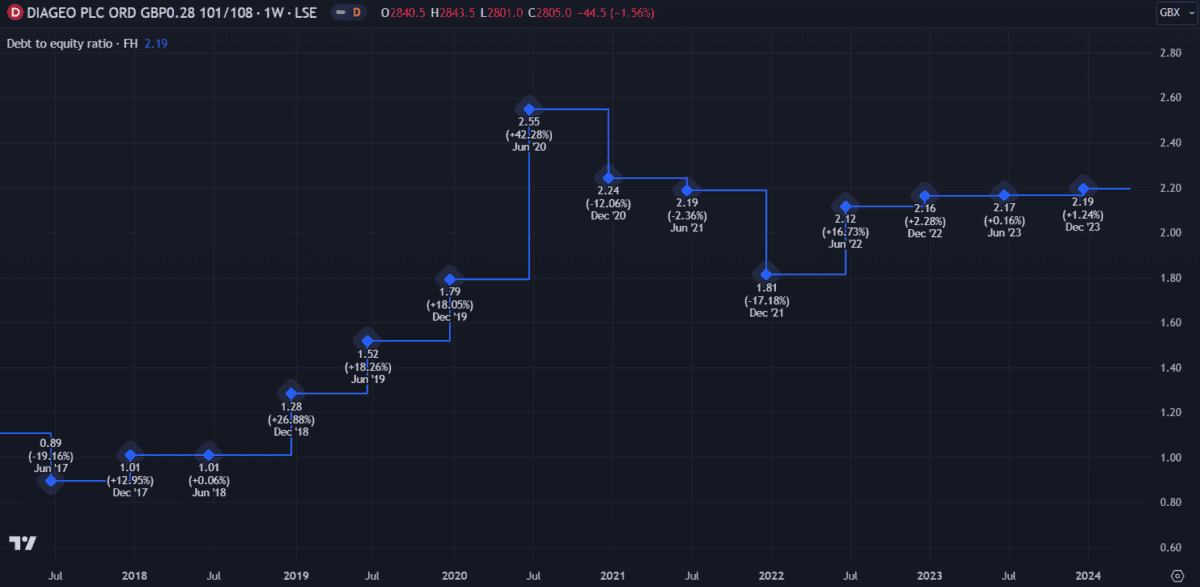 Diageo has a fairly clean balance sheet despite high debt. Its debt-to-equity (D/E) ratio shot up during the pandemic but has recovered and remained stable since. Although it’s high, it’s well-covered by operating cash flow and interest payments have a coverage ratio of 7.2.