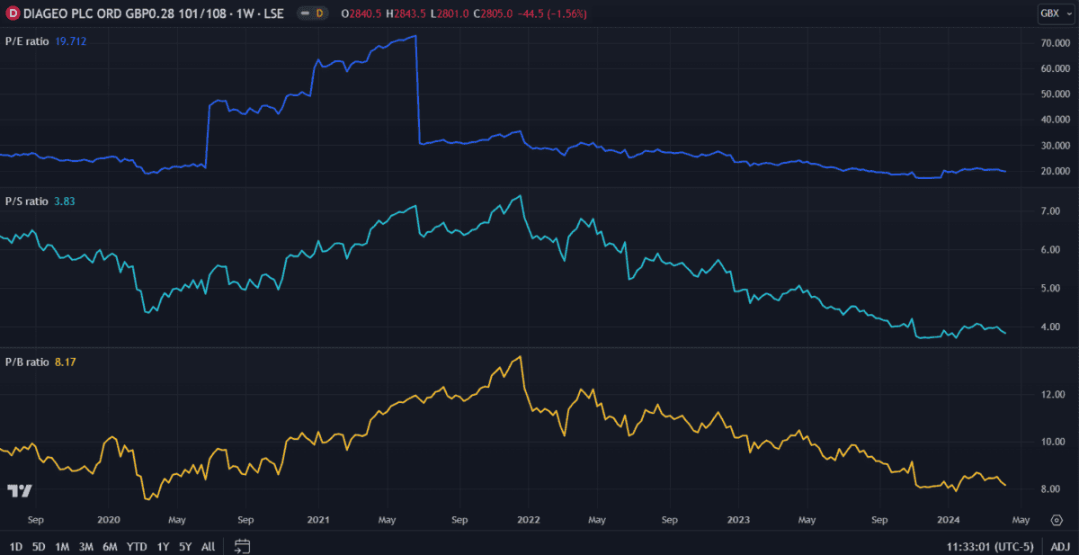 Industry peers like Associated British Foods and Coca-Cola HBC have slightly lower P/E ratios, on 17.4 and 16, respectively. Diageo is slightly above the industry average of 17.7. This supports a thesis of limited price growth going forward. A price-to-sales (P/S) ratio of 3.85 and price-to-book (P/B) ratio of 8.2 further support this thesis.