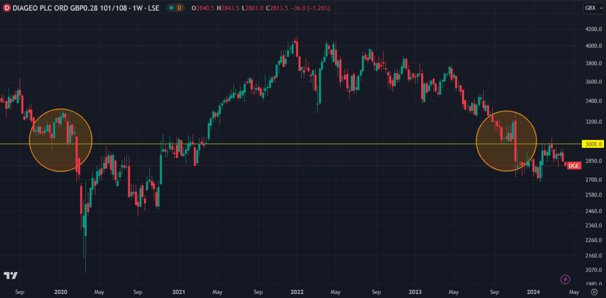 The situation mimics similar movements in 2019, when the price remained above £30 briefly before falling below it. The shares then struggled to break back above £30 until April 2021. If the price level proves to be as growth-resistant this time, it could be a long time before Diageo makes significant gains.