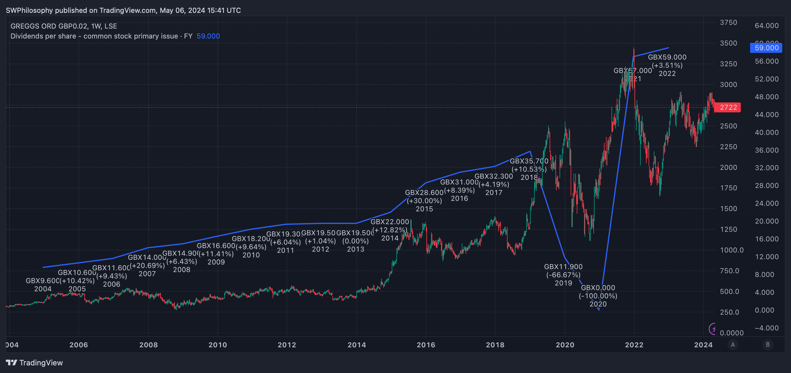 Since 2014, the Greggs share price has risen in line with its dividend, including a drop in 2020 during the pandemic. So if the dividend keeps growing, I expect the share price to follow.