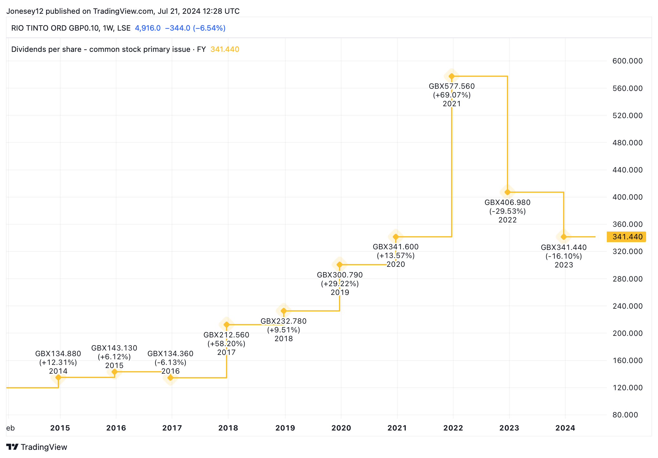 Like all mining stocks, Rio Tinto has been hit by the slowdown in China. Revenues hit $63.5bn in 2021 but slipped to $55.6bn in 2022 and $54bn in 2023.