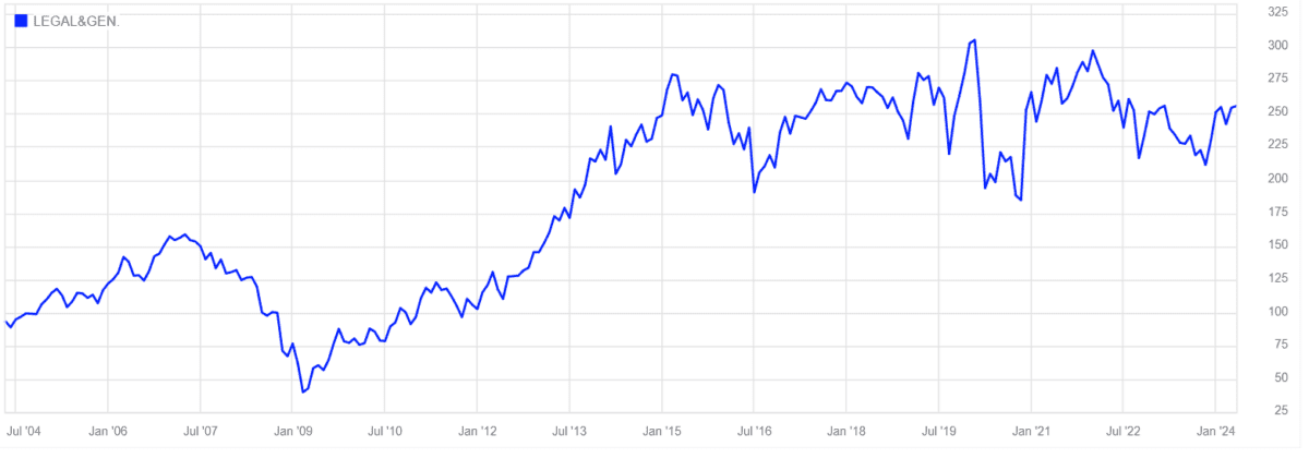 This is why I’ve bought shares in Legal & General Group (LSE:LGEN). Its share price hasn’t kicked on in recent years, but it remains 173% higher than it was 20 years ago.