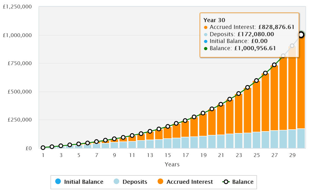 If I was looking to reach millionaire status after 30 years of investing, I’d need to invest exactly £478 each month based on this figure. A breakdown of total deposits and earned interest over the period can be seen below.