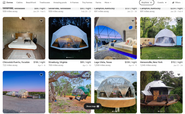 No matter how you choose to begin your search, the website lets you narrow down the type of housing you prefer by selecting tabs at the top of the page. These include everything from domes and cabins to treehouses and farms. You can also choose the amenities you would like including being close to a beach or having a pool.