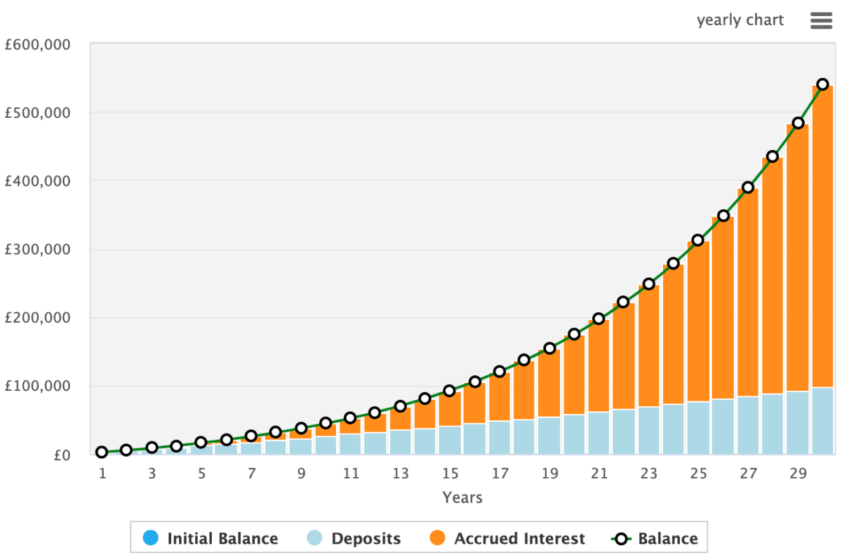 So here’s the equation. If I invest £200 a month, and increased this contribution by 2% annually while achieving 10% growth on average, after 30 years I’d have £539k.