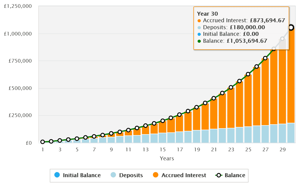 Past performance is no guarantee of future returns. But if past performance continues, a £500 investment distributed equally across these indices would turn into £1,053,695 after 30 years.