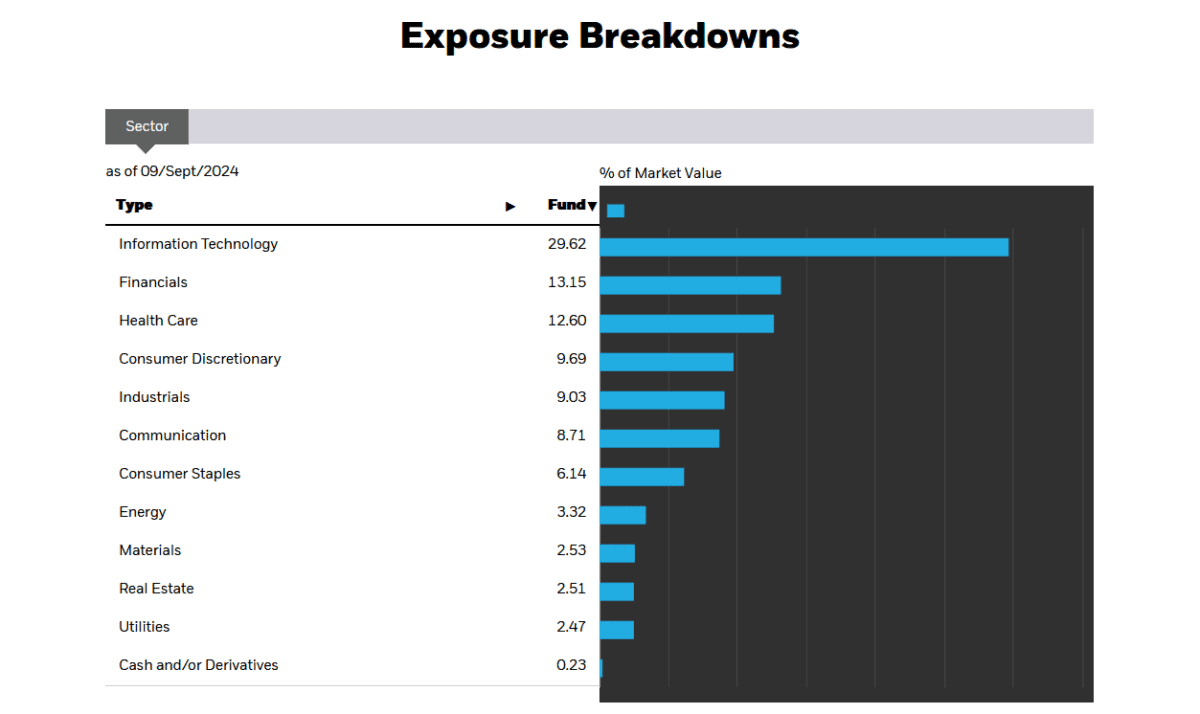 One thing investors need to know before buying is it’s deep investment in technology stocks. Almost 30% of it is tied up in information technology businesses like Nvidia, Microsoft, Apple and Meta.