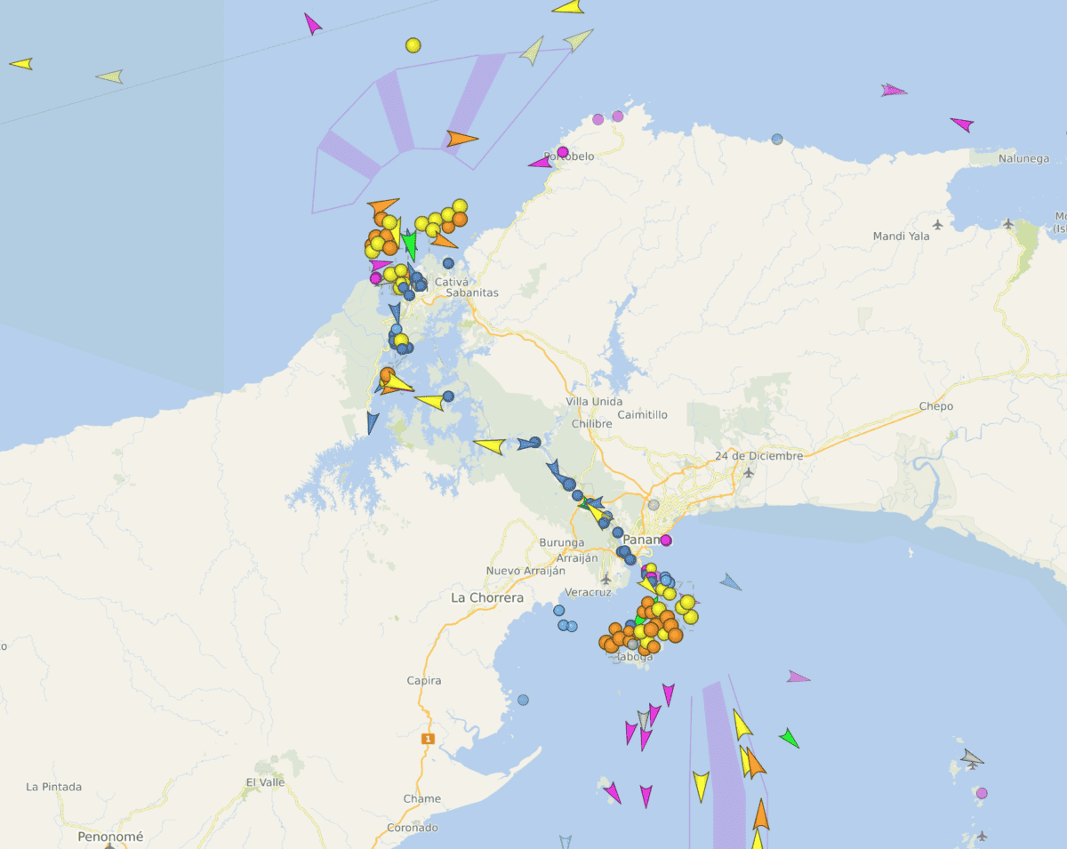 Likewise, vessels wanting to transit between the Atlantic and the Pacific are either sitting in queues near Panama or finding alternative routes. The number of ships transiting the canal has reportedly risen to 27, from 18 in January. But this is still down on normal numbers, and queues, as we can see below, are building up.