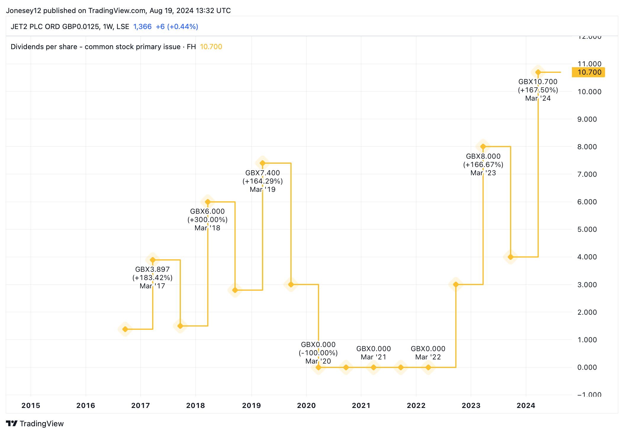 Jet2 resumed dividends in 2023, suggesting a stronger balance sheet than IAG. In 2023, Jet2’s board hiked the full-year dividend by a third, from 11p to 14.7p per share. Let’s see what the chart says.