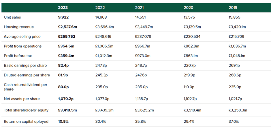 That could be because the company expects to build 10,500 homes in 2024. However, although an improvement on 2023, it’s 28.6% below its 2019-2022 average of 14,712.