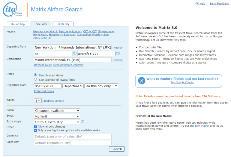 For many travelers, the most important aspects when booking a flight are cost and schedule. However, sometimes you may need to find specific fare class availability or want to book a particular flight or aircraft type. For those advanced searches, most online flight booking engines fall short. Thankfully, you can use a tool like ITA Matrix to do the job.