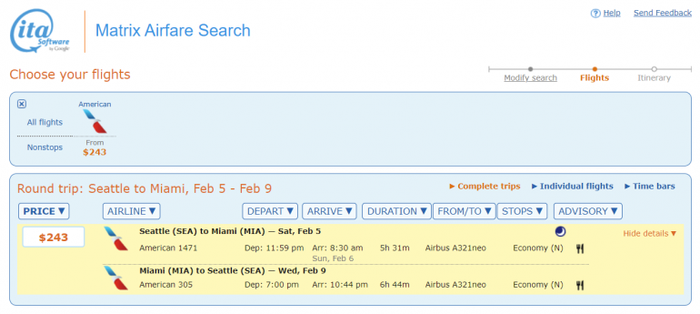 Searching for specific fare classes can also come in handy when booking flights for award mileage or elite status credits. For example, American Airlines flights credit to Alaska’s Mileage Plan program based on the fare class you book and the distance of the flight. And there can be a big difference in earnings between different fare classes.