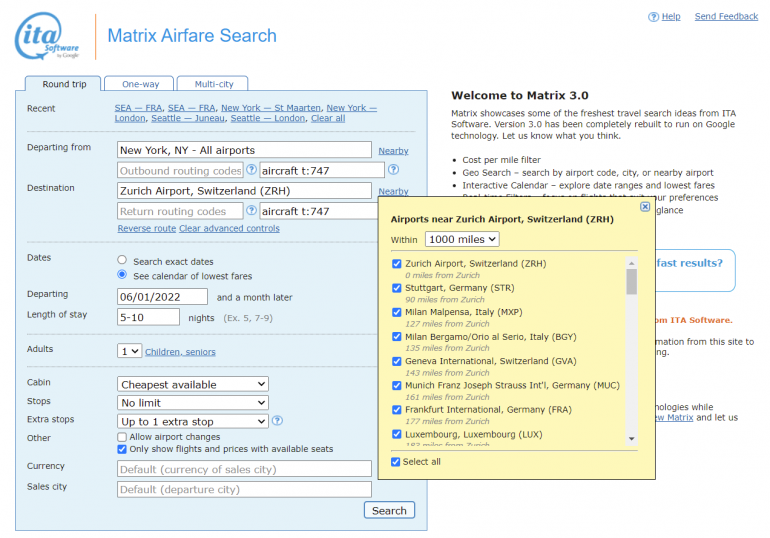 Or, perhaps you’re an AvGeek and want to fly on an endangered aircraft like the Boeing 747 or Airbus A380. You can combine ITA Matrix’s flexible route search with an aircraft filter to find the cheapest option to book and fly your white whale.