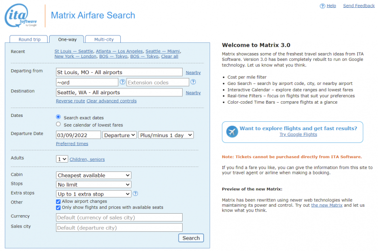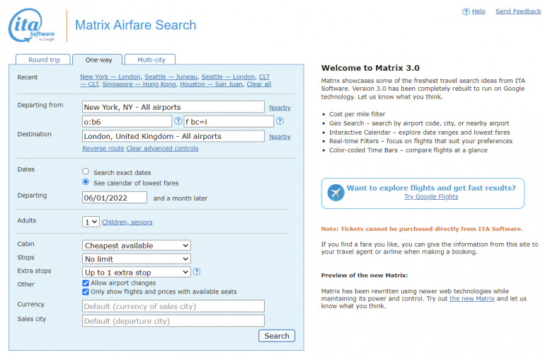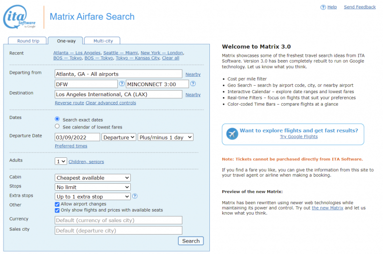 First, let’s reiterate that ITA Matrix isn’t right for every flight search. You can use a flight search engine such as Google Flights for most flight searches. Many search filters and flight options that were previously only found in ITA Matrix are now available on Google Flights. That means you can stick to using Google Flights if you’re looking to filter flight searches by: