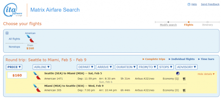 For example, in February 2022, the cheapest American Airlines fares between Seattle and Miami cost $160 round trip. Since these flights book into the “Q” and “O” fare classes, you’ll earn 1,362 Alaska miles (25% of the flight distance) and elite status credits from the round-trip flight.