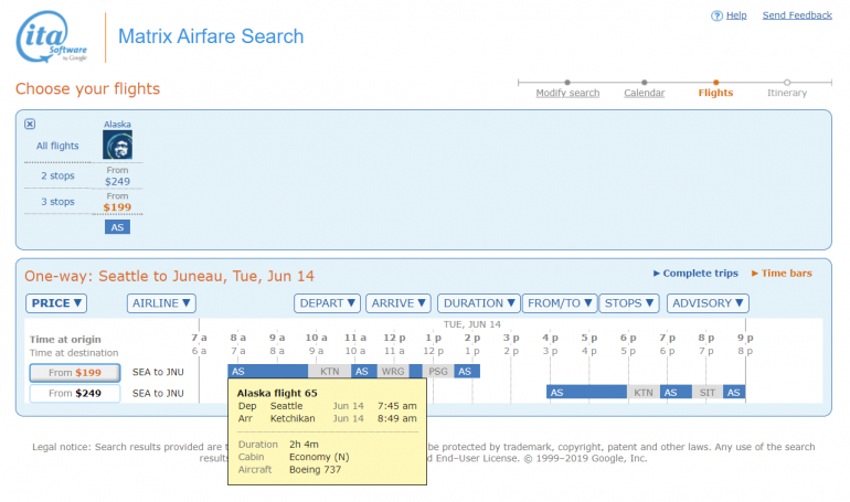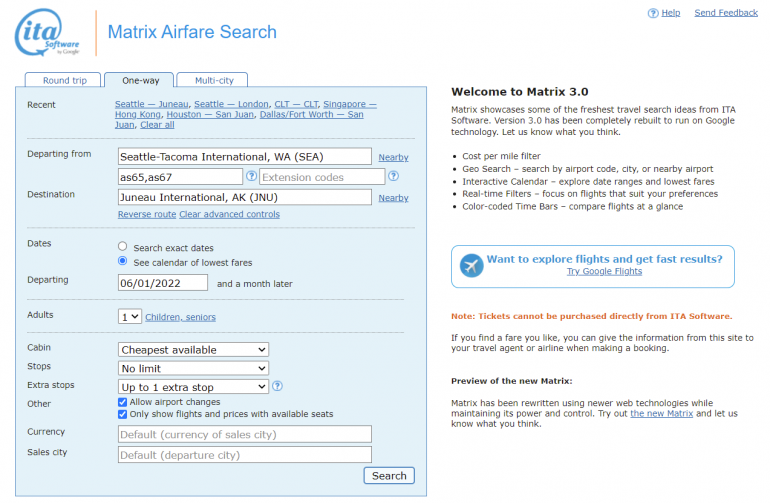 For example, say you want to find the cheapest date in June 2022 to fly a multi-stop flight on the Alaska Milk Run from Seattle to Juneau. To search through ITA Matrix:
