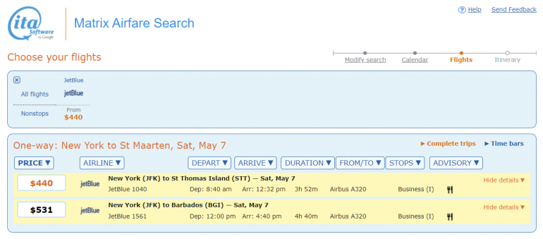 By searching through ITA Matrix like this, you’ll find that St. Maarten isn’t available on that date. But, you can book a JetBlue Mint award to St. Thomas or Barbados.