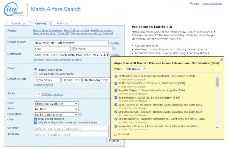ITA Matrix also helps make it easy to search a range of destinations. Say you want to fly JetBlue Mint to somewhere in the Caribbean on May 7, 2022. Enter an airport code in the general region — like St. Maarten — and use the nearby airport option to expand your search to any airport within 500 miles.