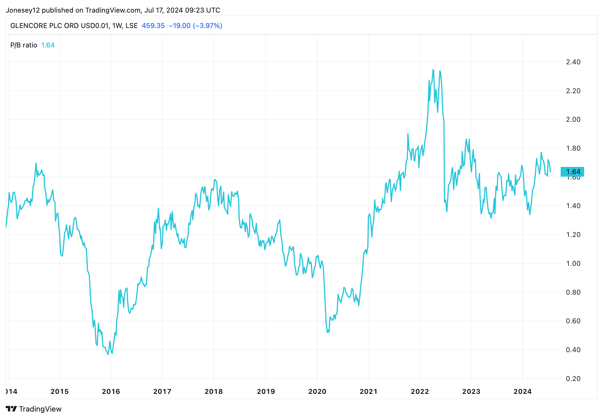 These concerns are reflected in Glencore’s share price, with the stock trading at just 13.7 times forward earnings. In April last year, its price-to-book ratio spiked to 2.34. Today, it’s back down to 1.63. It has been cheaper though. Let’s see what the charts say.