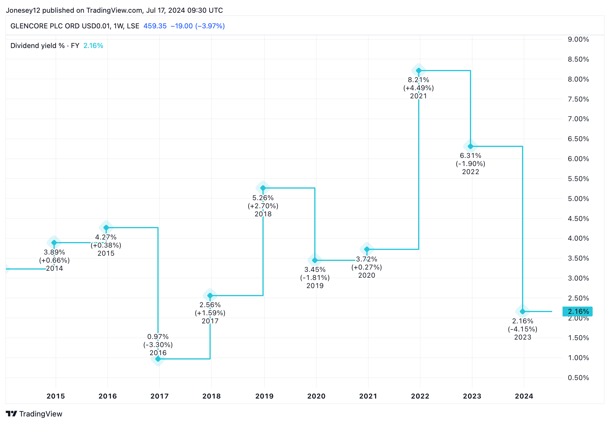 When I bought Glencore, the shares were yielding almost 6%. Dividend forecasts have now dropped sharply to just 2.23% in 2024 and 3.3% in 2025, as this chart shows. That’s a crushing disappointment for a dividend hound like me.