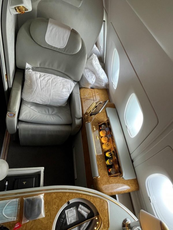 Emirates first-class suite feels genuinely luxurious. When you first sit down, you’ll notice a lot of extra touches that you won’t find in Qatar Qsuite, including: