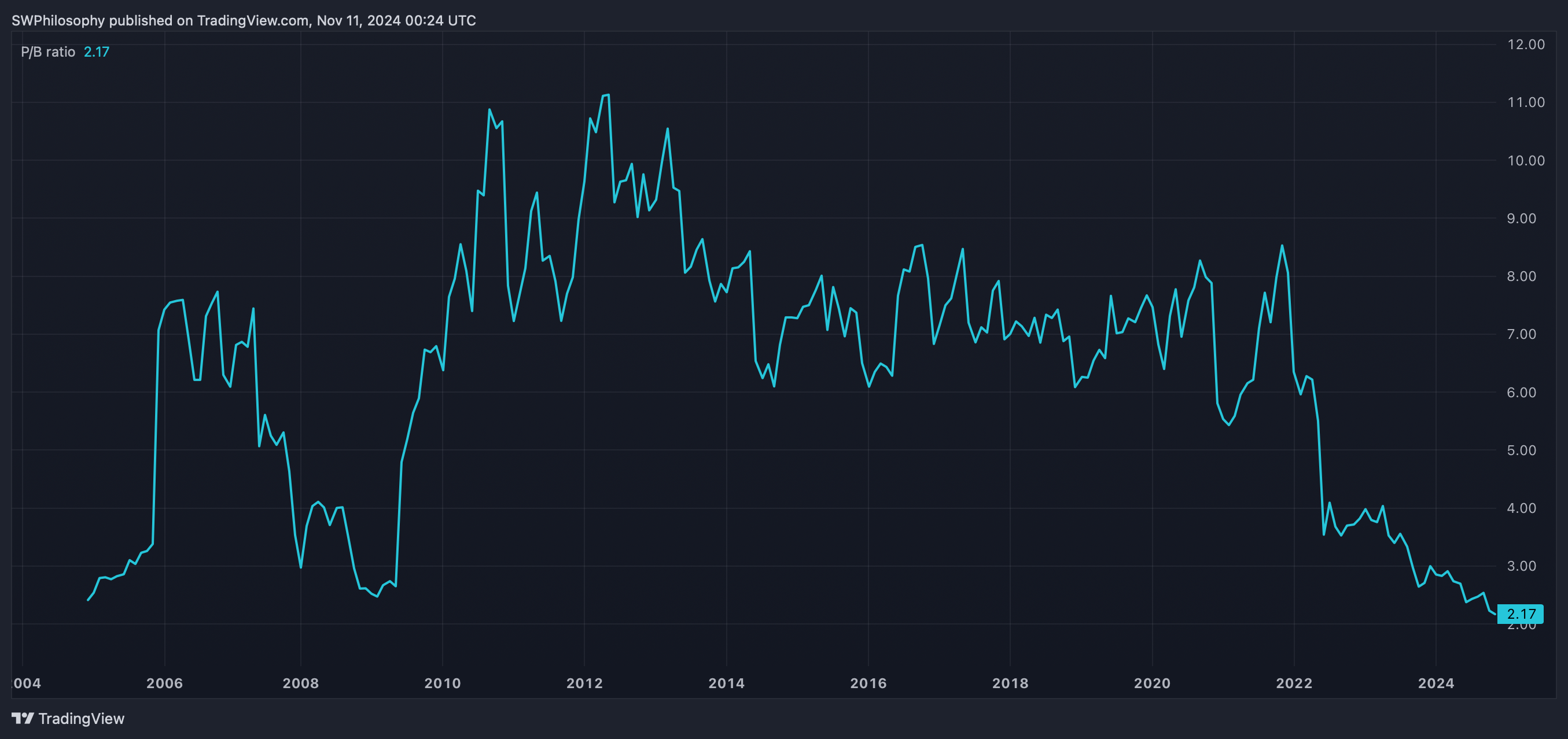 With Croda, I think the price-to-book (P/B) ratio is a much more useful valuation metric. The value of the company’s assets minus its liabilities is much less volatile than its net income.