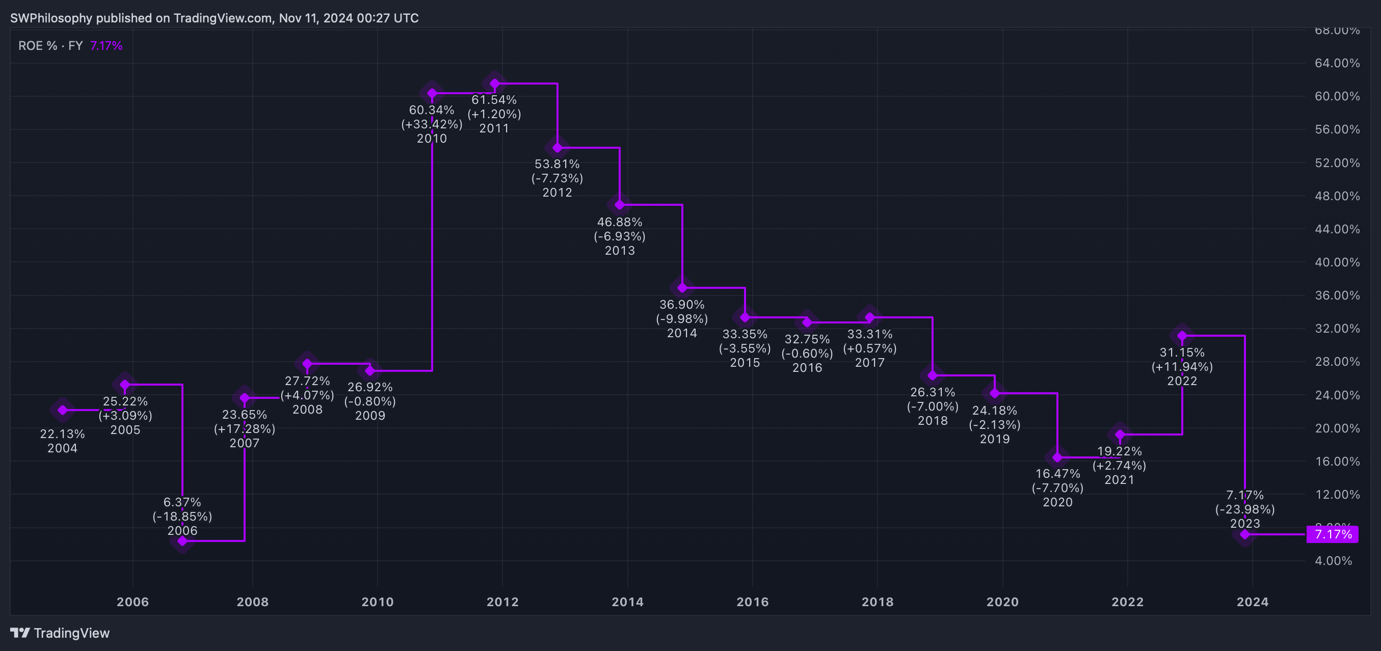 I think this is a good indication of how cheap the stock is, but there is a catch. Outside the pandemic, the return the company earns on its equity has been falling consistently since 2010.