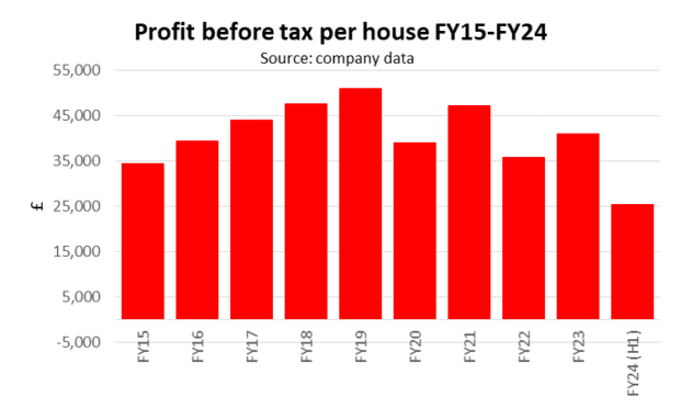 The big drop in its gross profit margin remains a concern. The average profit before tax per house was £25,442 in H1, compared to £50,952, in FY19.
