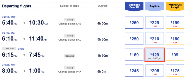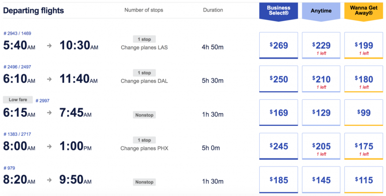 On the next page, you’ll be presented with flight options and available fare types: Wanna Get Away, Anytime and Business Select. The flights are listed chronologically based on departure time.