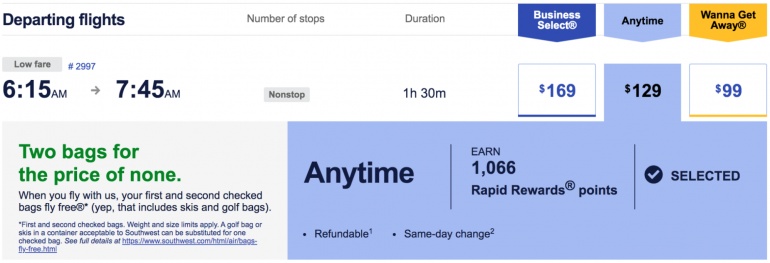 Anytime fares on Southwest provide passengers with more flexibility than Wanna Get Away fares but with fewer perks than Business Select fares. The extra rewards add quite a bit of value over Wanna Get Away fares, and the generous change and cancellation policy — which is worth its weight in gold in this day and age — makes the extra cost worth considering.