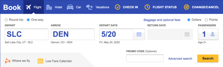 Let’s use a one-way flight from Salt Lake City to Denver in May 2022 as our example in both comparisons. The parameters are as follows, taking into account a valuation of 1.4 cents per Rapid Rewards point, as per NerdWallet’s estimate.