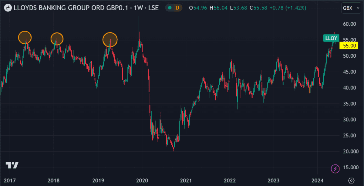 The Lloyds (LSE: LLOY) share price hit a high of 57.4p this week, nearing its highest level in nine years. Barring a few single-day price jumps in December 2019, the price has yet to trade consistently above 55p since August 2015.