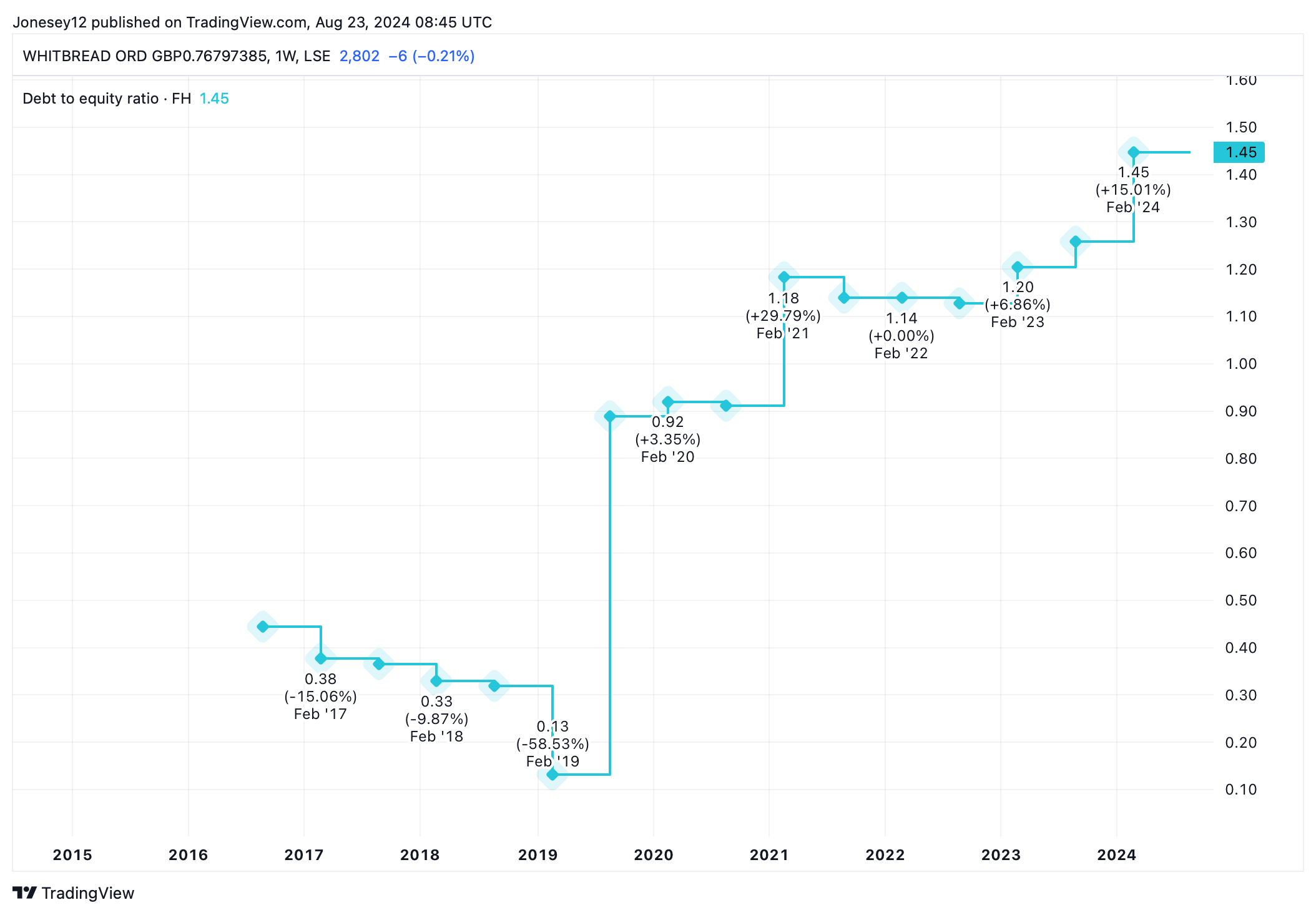 Whitbread nonetheless ended the year with net debt of £278m, a reversal of its 2023 net cash position of £173m. The group’s debt-to-equity ratio has climbed to a slightly worrying 1.45, as this chart shows.