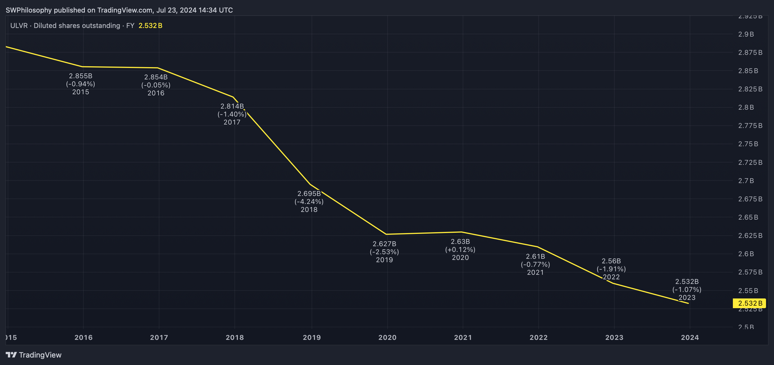 Unilever doesn’t have Coca-Cola’s record when it comes to buybacks. But over the last 10 years, the company has been steadily reducing its outstanding share count.